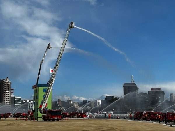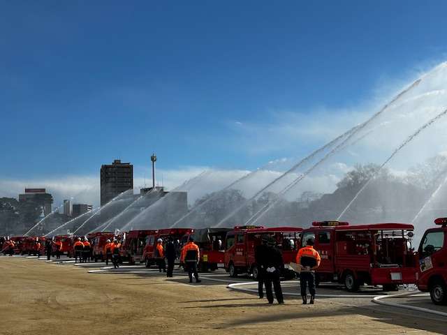 まあまあな寒さの中、式典、消防車両のパレード、消防署員による訓練デモンストレーション、一斉放水などを行った。